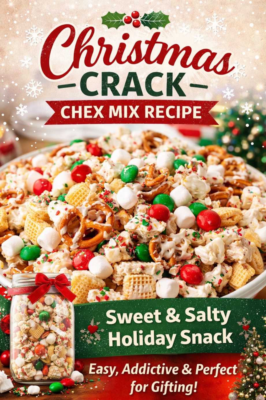 A Sweet, Salty, Addictive Holiday Snack Everyone Loves! If you’re looking for the perfect Christmas snack, this Christmas Crack Chex Mix is exactly what you need. It’s crunchy, sweet, salty, and dangerously addictive — just like “Christmas crack” should be! This recipe is quick, easy, and perfect for holiday parties, gift bags, and family movie nights. 🛒 Ingredients 👩🍳 How to Make Christmas Crack Chex Mix Step 1: Mix the Crunch In a large bowl, combine: Spread the mixture on a parchment-lined baking tray. Step 2: Make the Caramel Sauce In a saucepan, melt: Bring to a gentle boil for…