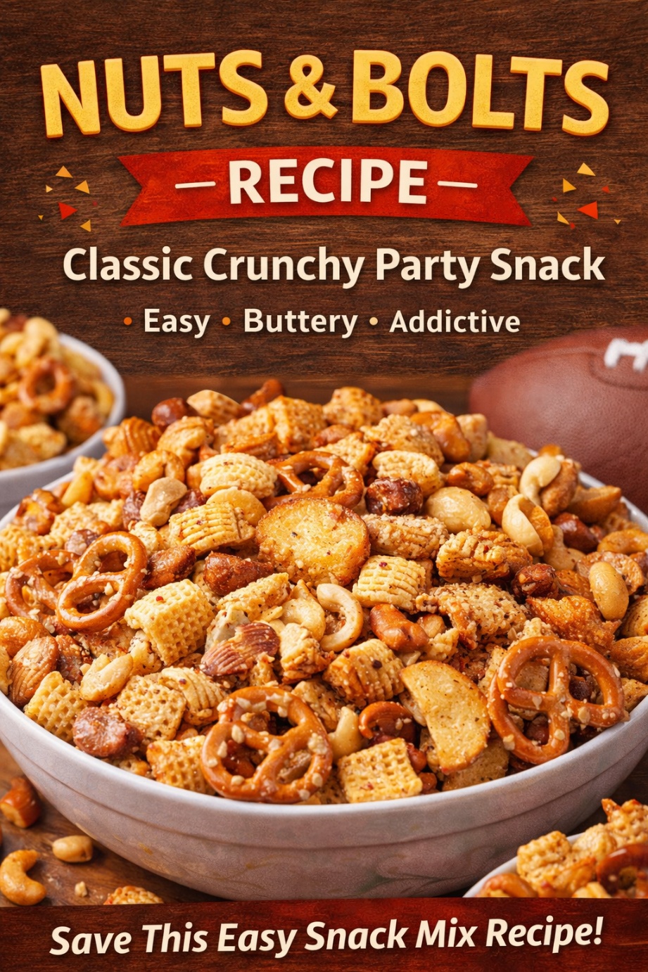 A Classic Crunchy Party Snack Everyone Loves! Looking for the perfect savory snack for parties, holidays, or movie nights? This Nuts and Bolts recipe is a timeless favorite! It’s crunchy, buttery, and packed with bold flavors — easy to make and impossible to stop eating. 🛒 Ingredients 👩🍳 How to Make Nuts and Bolts Step 1: Mix the Crunch In a large bowl, combine: Step 2: Make the Butter Sauce In a small bowl, mix: Step 3: Coat the Mix Pour the butter sauce over the snack mix.Stir well until everything is evenly coated. Step 4: Bake Spread on a…