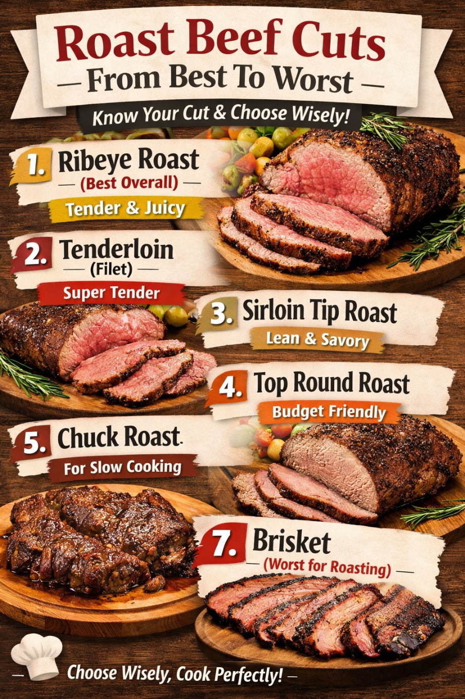 Choosing the right cut of beef can make the difference between a tender, juicy roast and a tough, chewy meal. Not all beef cuts are the same — some are perfect for roasting, while others are better for slow cooking or grilling. In this guide, we rank roast beef cuts from best to worst, so you can always pick the right one for your next meal. 🥇 1. Ribeye Roast (Prime Rib) – Best Overall Why it’s great: Best for:Holiday dinners, special occasions, and classic oven roasting. 🥈 2. Tenderloin (Filet Roast) Why it’s great: Downside:Less flavor than ribeye because…