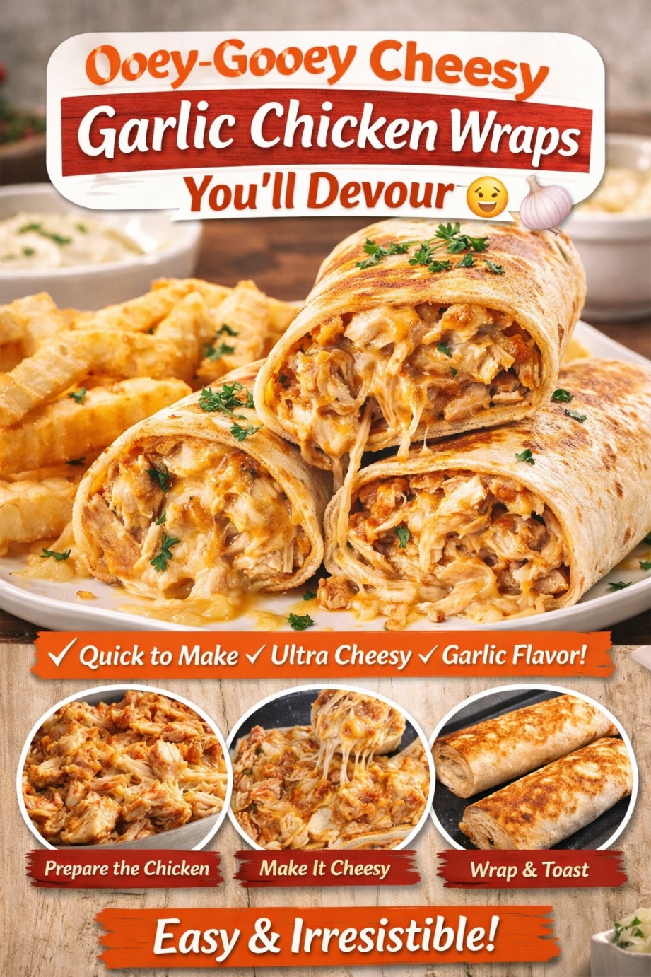 If you love cheesy, garlicky, and comforting food, these Ooey-Gooey Cheesy Garlic Chicken Wraps are made for you. They are quick to prepare, packed with flavor, and perfect for lunch, dinner, or even a late-night snack. This recipe is very popular in the USA because it’s easy, filling, and family-friendly. Why You’ll Love These Chicken Wraps Ingredients (USA Style) How to Make Cheesy Garlic Chicken Wraps Step 1: Prepare Garlic Chicken Heat butter and olive oil in a pan over medium heat. Add minced garlic and cook for 30 seconds until fragrant. Add cooked chicken, salt, pepper, paprika, and chili…