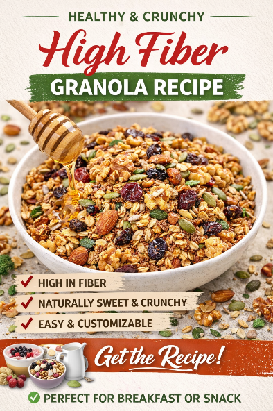 This high-fiber granola recipe is perfect for a healthy breakfast or snack. It’s crunchy, naturally sweet, and keeps you full