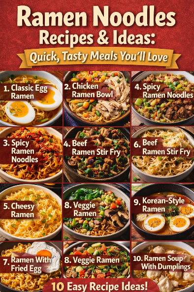 Ramen noodles are cheap, fast, and super easy to cook. But with a few simple upgrades, you can turn basic ramen into a delicious meal.Here are the best ramen noodle recipe ideas for breakfast, lunch, and dinner. 1. Classic Egg Ramen What you need:Ramen noodles, egg, green onions, soy sauce. Why it’s great:Creamy, comforting, and ready in 10 minutes. 2. Chicken Ramen Bowl Add:Shredded chicken, corn, carrots, garlic. Tip:Use chicken broth instead of water for better flavor. 3. Spicy Ramen Noodles Perfect for spice lovers!Add chili oil, red pepper flakes, and hot sauce. 4. Beef Ramen Stir Fry What makes…